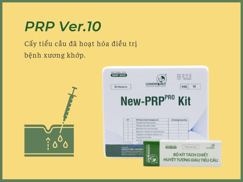 PRP Ver.10 là bộ KIT được thiết kế đầy đủ các thành phần cần thiết từ việc thu máu, phân tách huyết tương, tiểu cầu, hoạt hóa tiểu cầu. Nhờ vào bộ KIT, tiểu cầu và các yếu tố tăng trưởng được làm giàu từ 6 - 8 lần so với máu bình thường. Toàn bộ các yếu tố tăng trưởng có trong tiểu cầu thu được, được kích thích giải phóng đến 99% ra ngoài, góp phần vào việc điều trị hiệu quả bệnh thoái hóa khớp gối.
